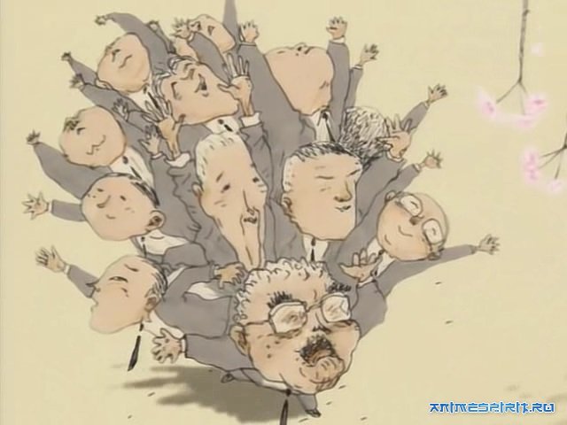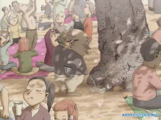Дальше действия происходят абстрактно, от косточки проростает сакура.Спустя время под деревом собирается народ, интенсивно пьющий и празнующий. Это раздражает старичка и он вырывает свое дерево с корнем. После наместе вырванного дерева,в углублении собирается вода от дождя и так образуется озеро. Наступает лето и нарол опять приходит на то место,теперь уже купаться, плескаться и веселится.