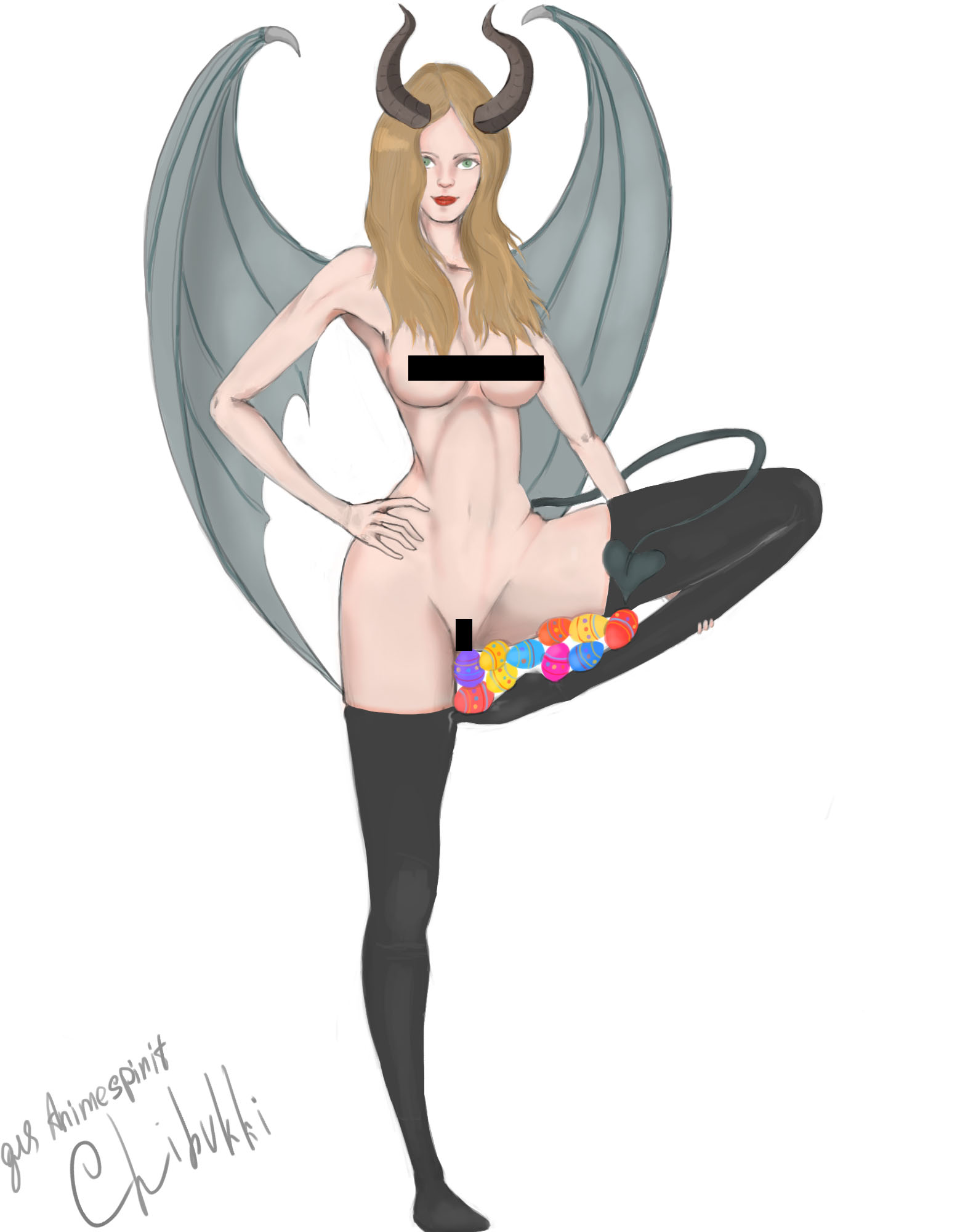 Рисунок от пользователя den220v. Не люблю комментировать чужое, но...Так как самой нравится, когда дают дельные советы или хотя бы просто делятся впечатлением, то (раз уж начала...) 1. Соответствие теме (насколько точно художнику удалось передать заданную тематику) - 6 баллов. Тематика явно не пасхальная. У меня создалось впечатление, что существо рисовалось спонтанно. Вдохновился - изобразил. А потом уже, а-а-а, пасхальный элемент добавить и хоп - цензура в качестве яиц... 2. Композиция (пропорции и логические ошибки) - 8 баллов. Понравилось соотношение пропорций в плане размера (голова, руки, ноги...). Но...пресс несколько смещён вбок, рога не по центру, отсутствие фона, левый бок складка как-то не очень, хвост чуток неровный, левая нога от колена чуть ли не одной ширины, правая изображена более правильно... 3. Стиль исполнения (стиль художника, а не направление живописи) - 9. 4. Восприятие (что понравилось, чего не хватило) - 7 Понравилось кокетливое выражение лица девушки, руки (ибо самой удаются далеко не всегда...), цвет волос приятный, сердечко на кончике хвоста порадовало. Но...отсутствие фона (полное отсутствие) портит восприятие. Бывают ситуации, когда фон не нужен, но тут хотелось бы...Яйца, располагающиеся в таком месте, тоже не порадовали. Нет, я не сильно религиозный человек. Просто если бы она держала бы в одной руке этот атрибут, было бы чуток лучше...А то ассоциации как-то не очень... А в общем, автору удачи и творческих успехов!